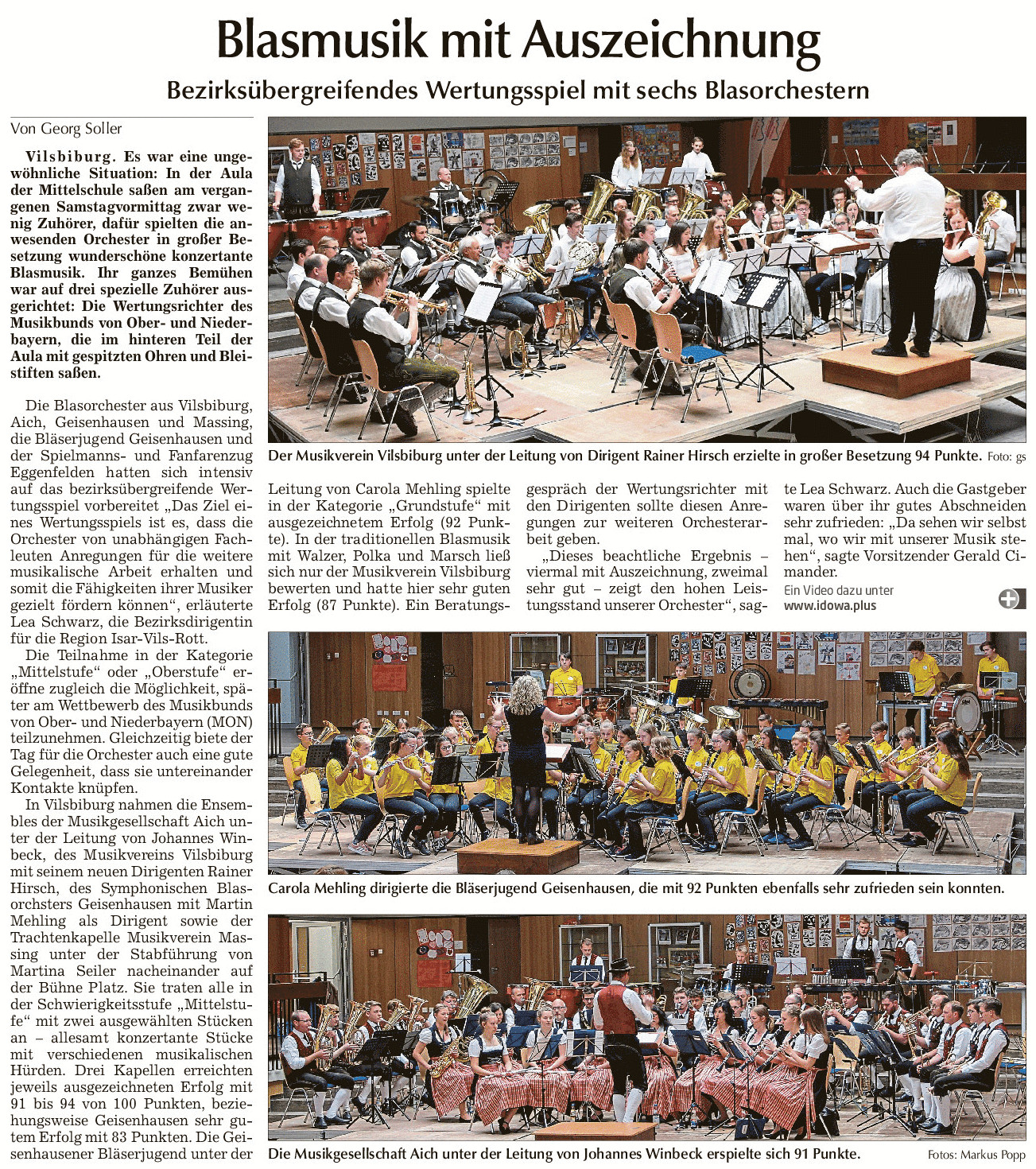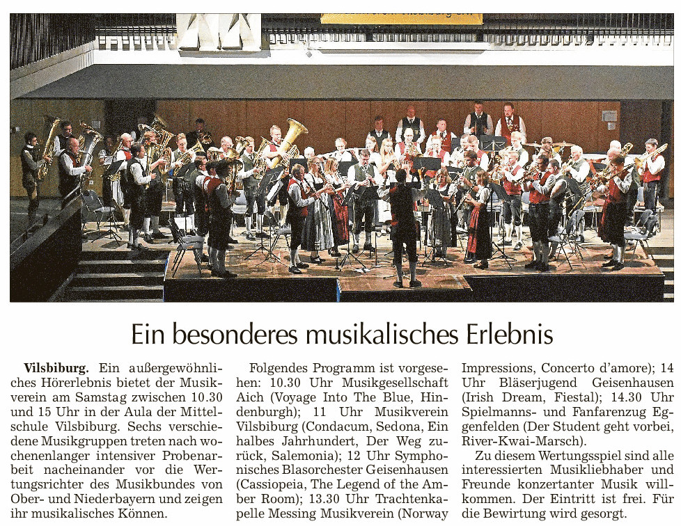 Am 25.5.2019 fand in der Aula der Mittelschule Vilsbiburg ein Wertungsspiel der Bezirke Inn-Salzach und Isar-Vils-Rott (Musikbund von Ober- und Niederbayern e.V.) statt.